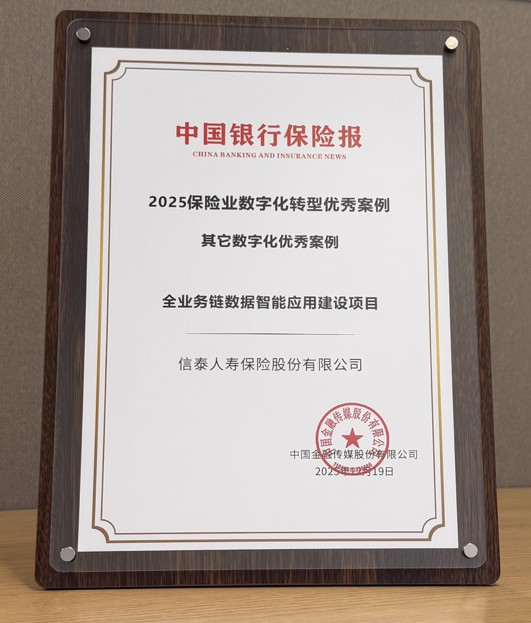近日,中国金融传媒股份有限公司发布“2025保险业数字化转型案例”评选结果。信泰人寿保险股份有限公司(以下简称“信泰保险”)申报的“全业务链数据智能应用建设项目”成功入选《2025保险业数字化转型优秀案例集》。
